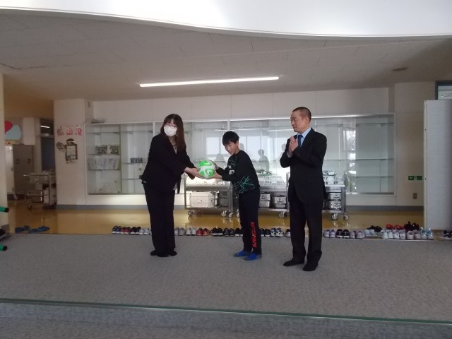 12月23日に明治安田生命様よりサッカーボールの寄贈がありました。児童会長の田渕さんが受け取りお礼の言葉を伝えました。これから全校児童で大切に使わせていただきます。明治安田生命様ありがとうございます。