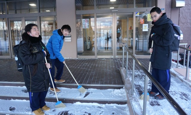 玄関掃除後、そこにある雪もはらってくれている生徒がいますとの報告をうけました。あらためてその時の様子を再現してもらい撮影しました。今日もとても寒い日でしたが、心がホッと(hot)になりました。