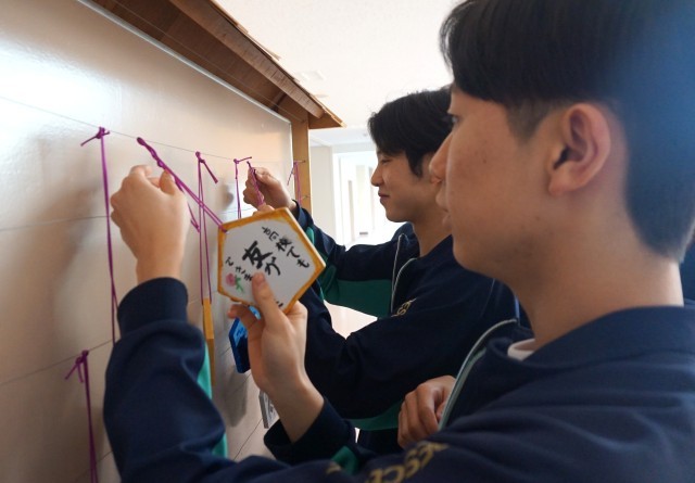 3年生は絵馬を作成し、特設掲示板に飾っています。一人一人の願いを込めた漢字、その意味が両面に描かれています。
