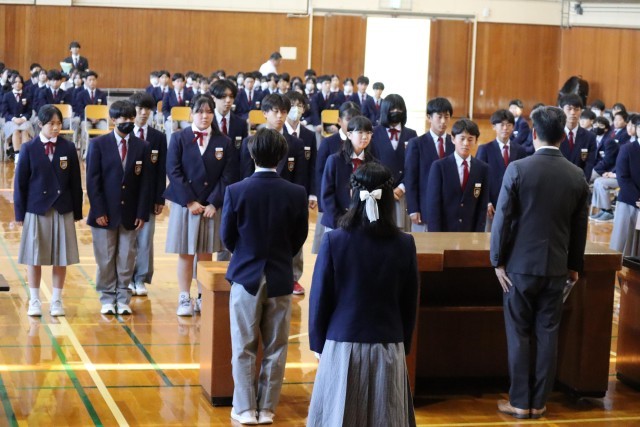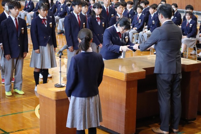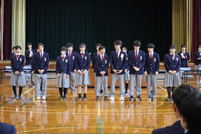 次なる三中へのバドンタッチ! 公開日 2025/10/17 更新日 2025/10/17 お知らせ 10月17日(金)、認証式が行われました。8日(水)に生徒会役員選挙が行われ、本日、静内三中の世代交代の儀式が行われたことになります。 3年生の生徒会も、本日をもって役目を果たしたことになりますが、まだ卒業はしていませんので、しっかりと後輩の仕事をサポートしてほしいと思います。これからの三中に乞うご期待!