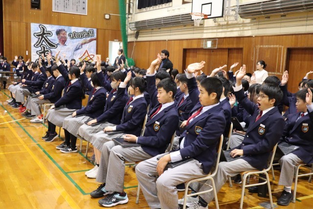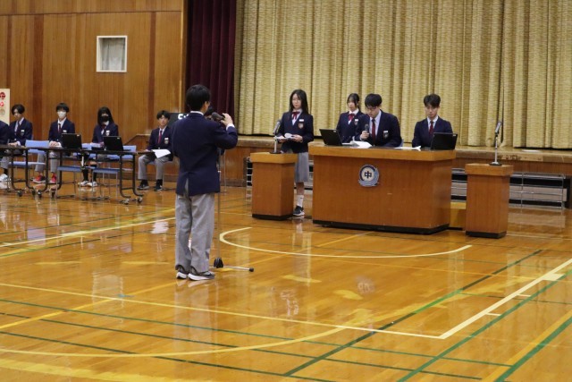 やさしさの中にも厳しい目を! 公開日 2025/11/06 更新日 2025/11/06 お知らせ 11月5日(水)、生徒総会が行われました。本日は、新旧生徒会がそれぞれ「反省と計画」を担う節目の会となりました。 先生からの講評では、「意見を述べる人たちは、単に意見のみならず、提案も交えた話ができていてよかったと思います。時には学校全体を厳しい目で見るという視点も重要です。時には厳しいことも言える人間関係づくりも大切ですね。」 3年生の生徒会の皆さんは、1年間(2年間)本当にお疲れ様でした。