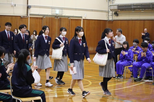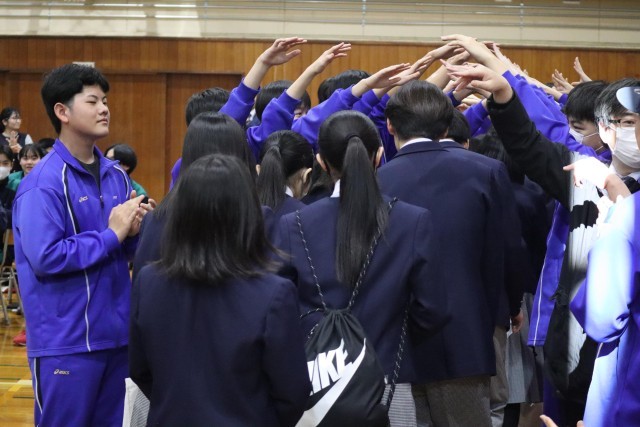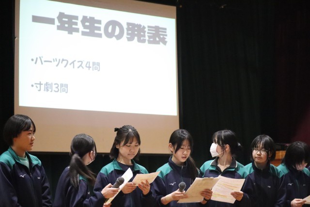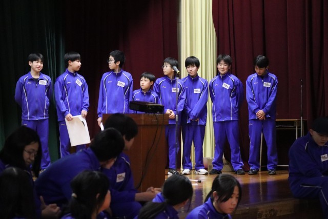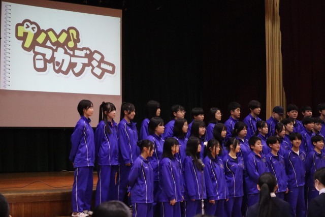 卒業(おでめ)とう! 公開日 2026/03/11 更新日 2026/03/11 お知らせ 3月10日(火)、予餞会(卒業生を送る会)が行われました。在校生は、卒業生への感謝の気持ちを贈るため、また、卒業生も後輩にこれまでの伝統を継承するための行事です。 各学年とも、クイズや合唱、綱引きなどそれぞれの学年らしさが出た予餞会となりました。なかでも笑いを誘ったのは「卒業おめでとう!」を「卒業おでめとう!」と表現してしまった1年生。そんなハプニングもよい思い出ですね。 +7