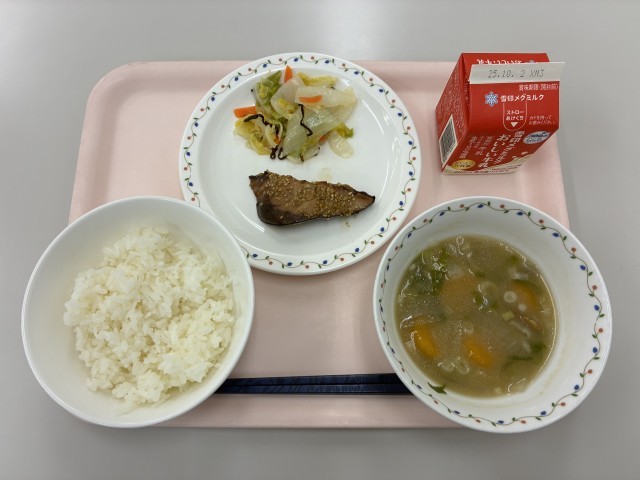 ごはん かぼちゃ団子汁 ぶりゴマ照り焼き 白菜の塩昆布和え 牛乳