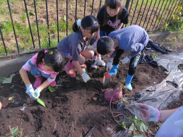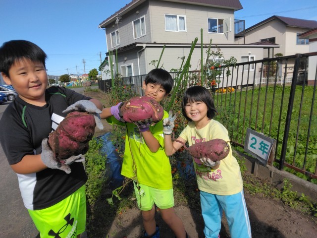 大きなお芋がとれました!! 公開日 2025/10/06 更新日 2025/10/06 今日のパチリ 10月6日(月)に2年生が畑に植えていた「サツマイモ」を掘りました。ながいつるを引っ張ると、すごく大きなイモが姿が見え、2年生はみんなで「うわー」という声を上げていました。教科書にある「おおきなかぶ」のようにみんなで「うんとこしょ。どっこいしょ。」と引っぱりました。顔くらい大きなイモにびっくりの2年生でした。