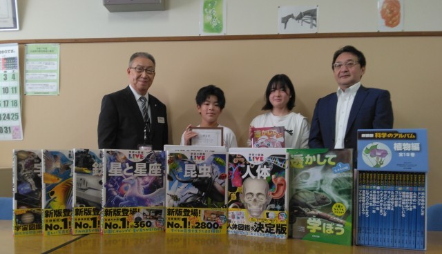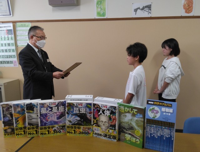 ブックパック贈呈式がありました 公開日 2025/10/08 更新日 2025/10/08 今日のパチリ 教育公務員弘済会から学校図書助成事業として「ブックパック」を静内小に頂きました。本日10月8日(水)に弘済会の方が来校し、校長室で贈呈式が行われ、写真のようにたくさんの図鑑をいただきました。図書委員会の委員長・副委員長が代表して受け取りました。大切に読ませていただきたいと思います。