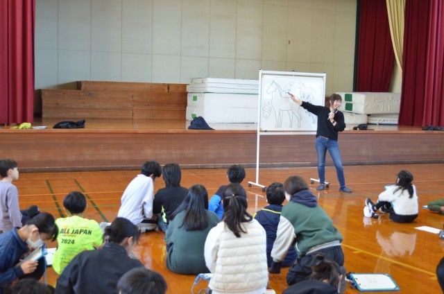 馬のイラストのポイントを教えてもらい、子どもたちもそれを真似して取り組んでいました。