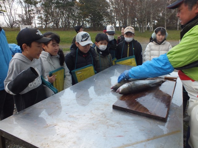 イオル再生体験事業に参加しました 公開日 2025/10/28 更新日 2025/10/28 今日のパチリ 10月28日(火)、4年生が、教育委員会主催のイオル再生事業に参加しました。アイヌの方たちにとって大切な食材である鮭の採り方や解体について教えてもらいました。アイヌの方たちの住居である「チセ」にも入りました。 実際に見て、触ることで理解を深めることができました。