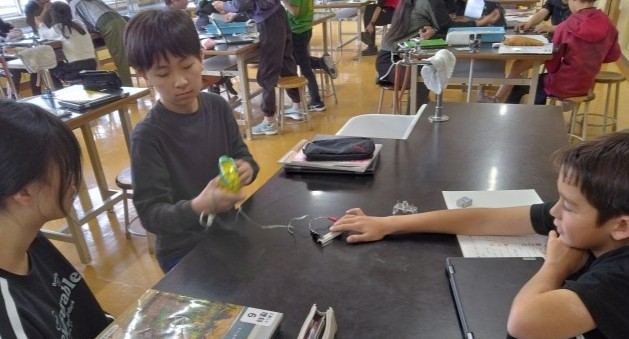 本日は手回し発電機を使って電気を作り、電球を光らせたり、電子オルゴールを鳴らしたりする実験をして記録をしていました。