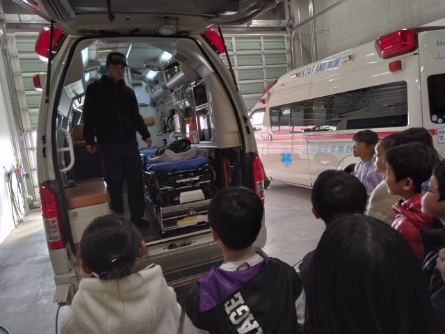 消防署の見学 公開日 2025/11/26 更新日 2025/11/26 今日のパチリ 11月26日(水) 3年生が社会見学で消防署の見学に行きました。消防署の中の様子や、消防車の中や救急車の中を見せてもらいました。普段見ることができないので、3年生はいろいろな道具に興味津々。子どもたちの質問にもたくさん答えていただきました。消防署の皆さんありがとうございました。