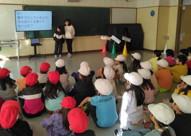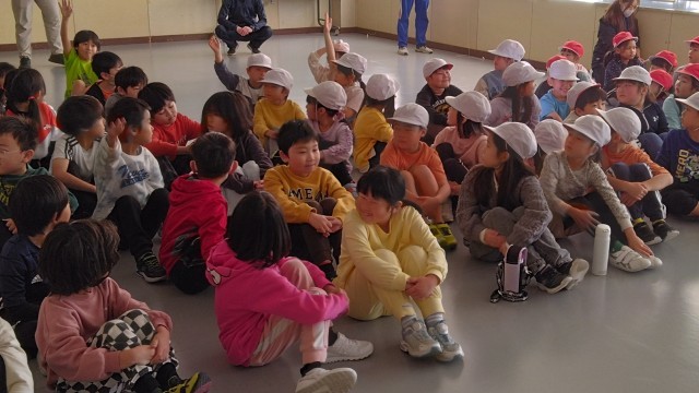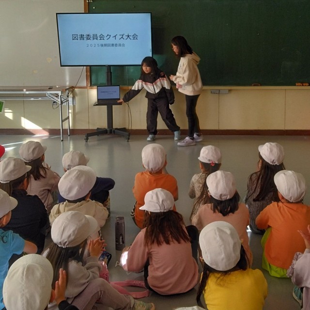 図書委員会のクイズ大会 公開日 2025/12/02 更新日 2025/12/02 今日のパチリ 12月2日(火)中休みに図書委員会による「クイズ大会」が行われました。1・2年生はわかったときは元気に手を挙げて、クイズを楽しんでいました。「図書室にはいろいろな本もあって、クイズの本もあるからぜひ図書室に遊びに来てくださいね」というお話もありました。