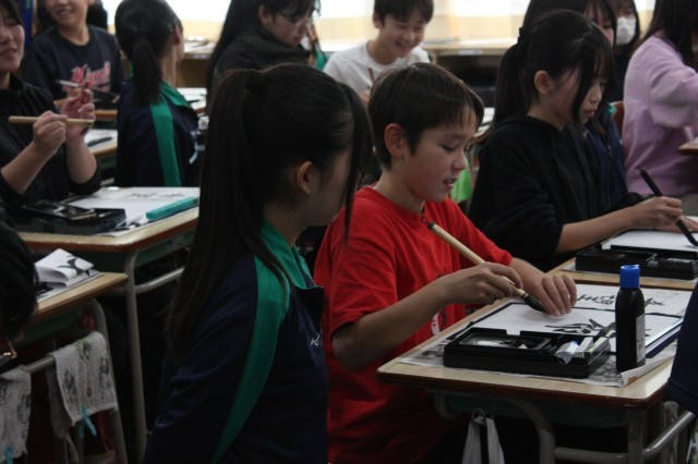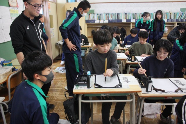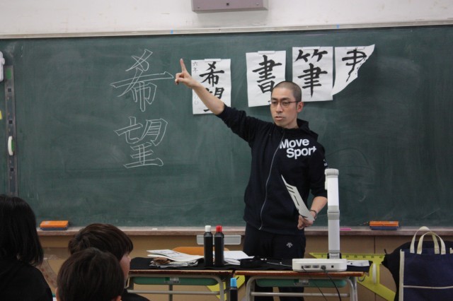 静高書写教室6年生 公開日 2025/12/16 更新日 2025/12/16 今日のパチリ 12月12日(金)に静内高校書写教室がありました。今日は6年2組で習字「希望」の字を書くポイントを教えてもらいました。たくさんの生徒さんも来てくれて、個人個人丁寧に教えてもらいました。次回は3学期。5年生が教えてもらう予定です。