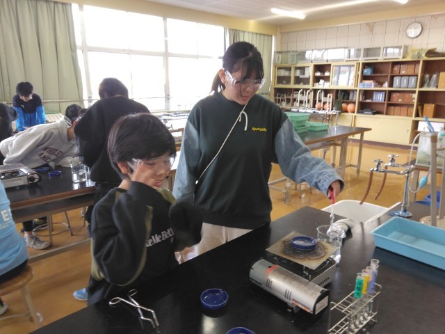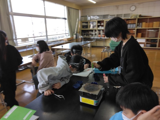 学習の様子(6年理科) 公開日 2025/12/16 更新日 2025/12/16 今日のパチリ 12月15日(月)6年生の理科の学習の様子です。「水溶液」を蒸発させて、何か物が残るか?という実験をしていました。中には臭いにおいのする水溶液もあるので、気をつけながら扱っていました。